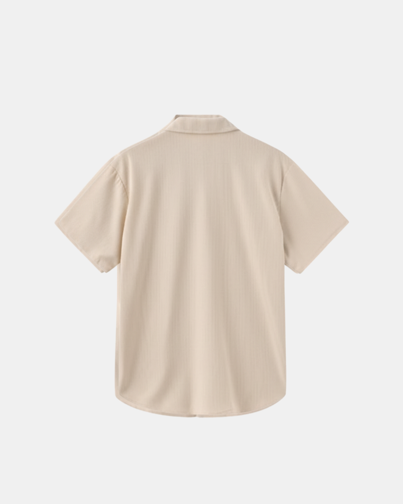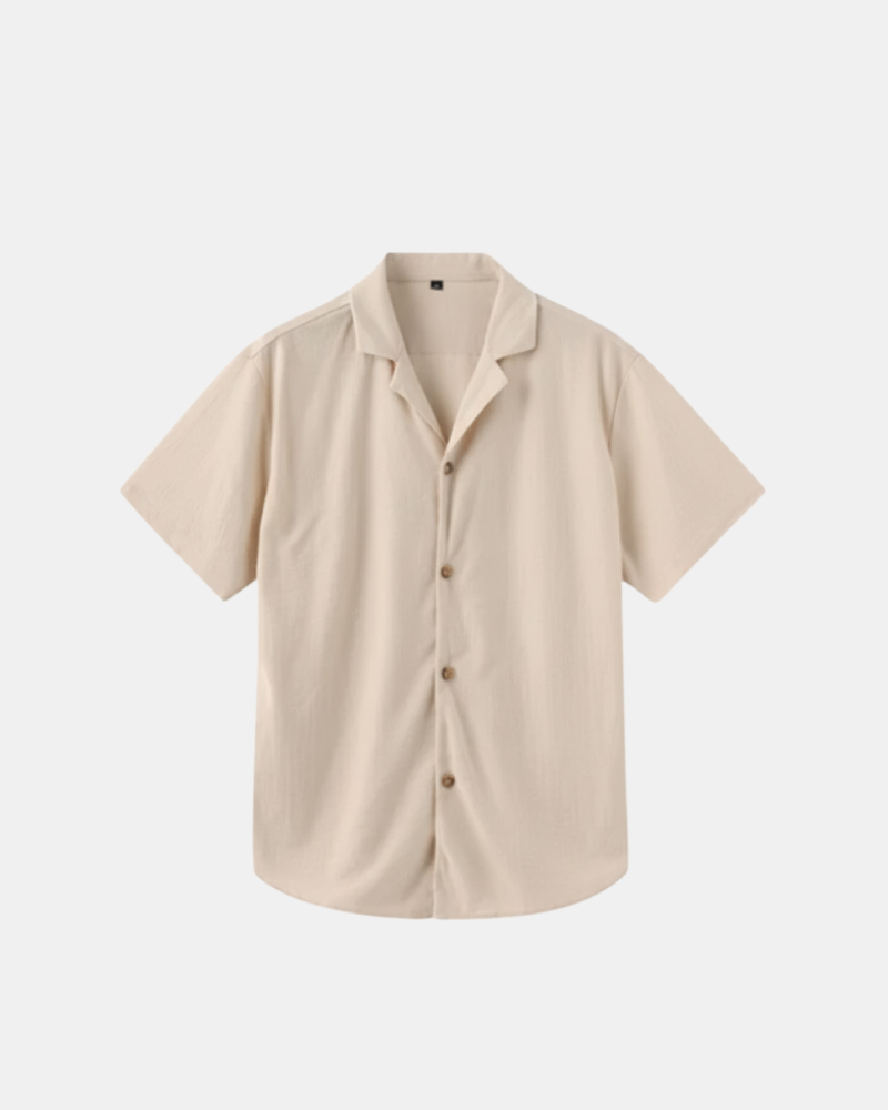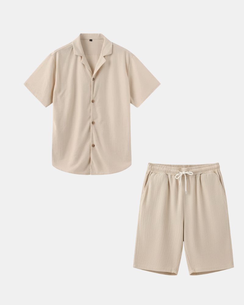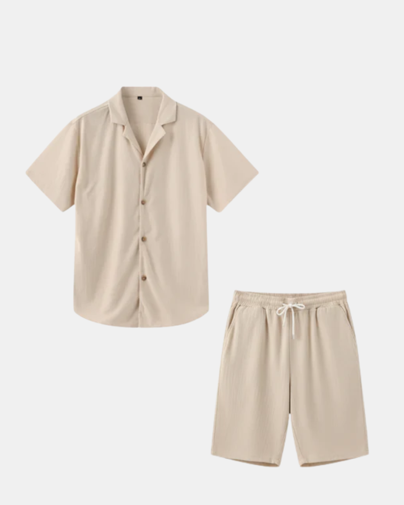 Το πουκάμισο με ανοιχτό γιακά και το tailored σορτς αποπνέουν χαλαρή κομψότητα, συνδυάζοντας τη μοντέρνα κομψότητα με τη διαχρονική ελληνική άνεση.