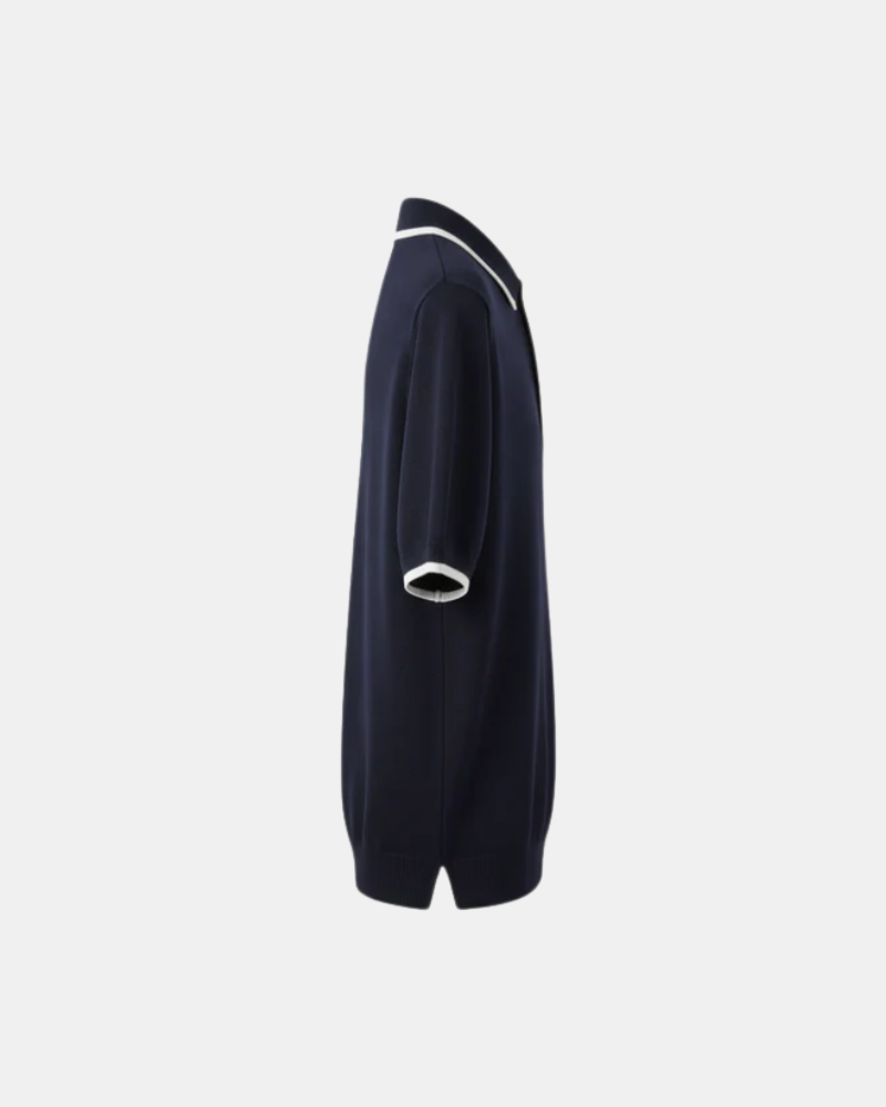 Crafted from a lightweight cotton knit blend, this polo redefines modern elegance through minimal detail and precise construction. The open collar and contrast trim create a subtle statement, while the soft texture and clean silhouette ensure comfort without compromise.