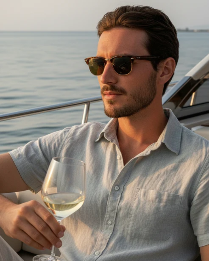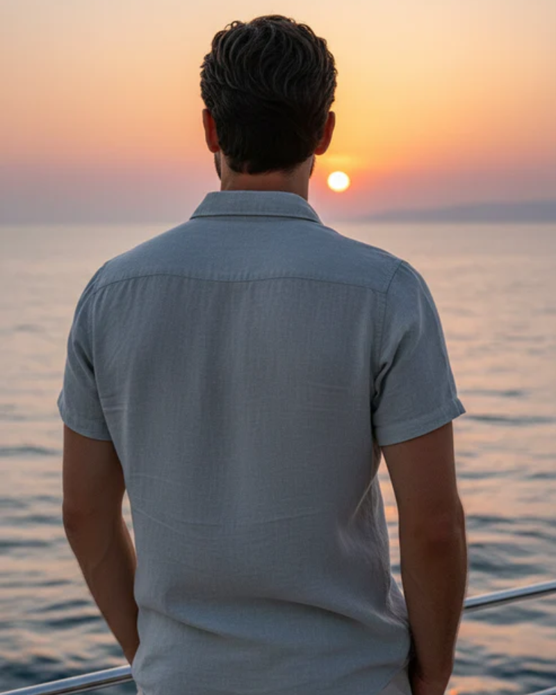 Confeccionado en lino europeo de primera calidad, este conjunto personifica la sofisticación natural de las noches de verano en la Riviera. Sus suaves tonos neutros y su textura transpirable reflejan el encanto atemporal de la elegancia costera, ideal para cenas en yate o paseos junto al mar bajo la luz dorada.